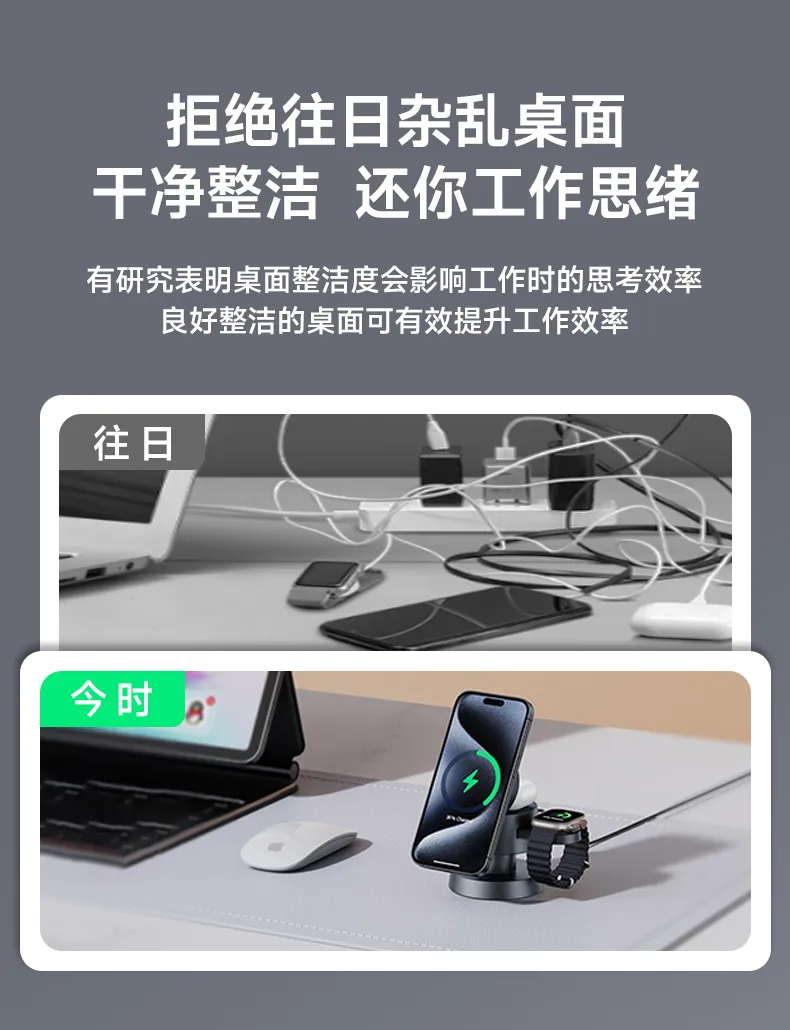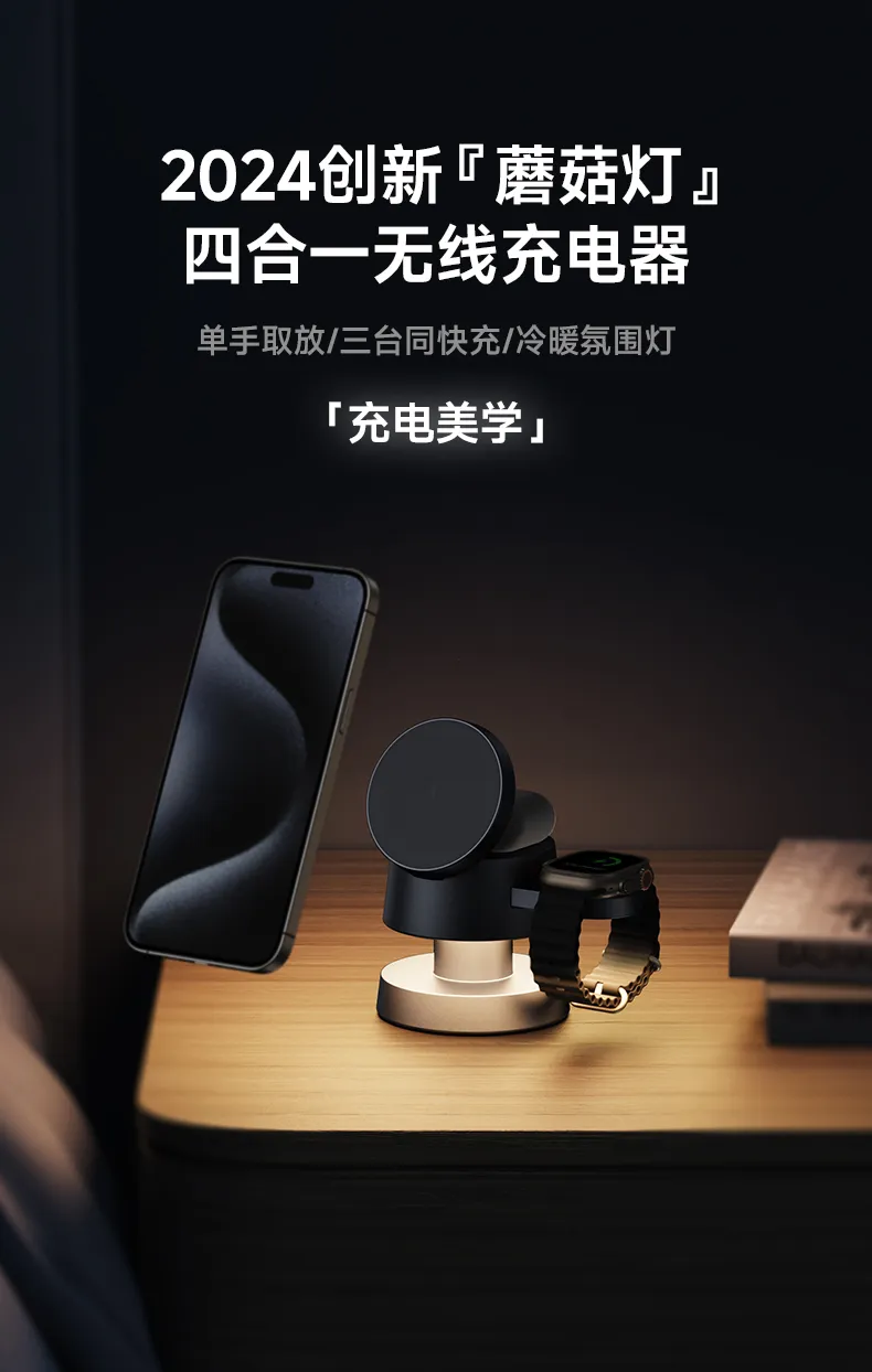 Three-in-One Wireless Charger Night Light Magnetic Absorption iPhone 14 15 Charging Base Apple Watch S9 Stand AirPods Desktop